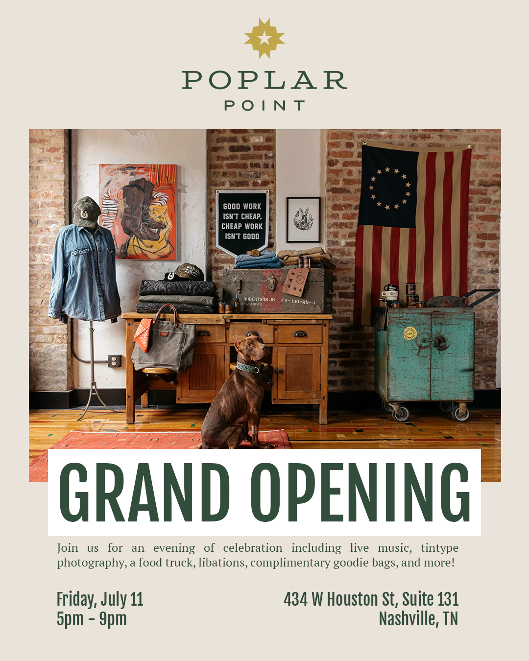 While working with Favorite Records in Nashville TN, I developed an admat design for the grand opening campaign for Poplar Point, a textile, clothing, and accessories manufacturer and retailer in Wedgewood Huston, Nashville.